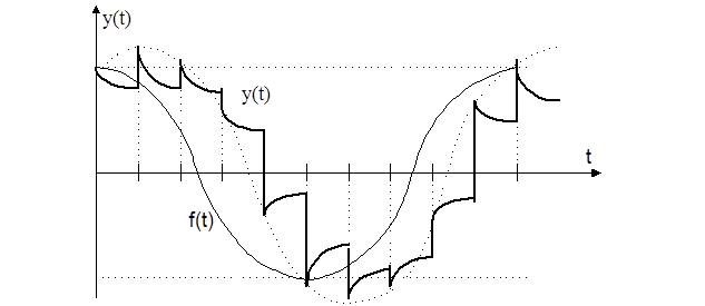 Наиболее простым и часто применяемым низкочастотным фильтром является экстраполятор нулевого порядка. При этом решетчатая функция в качестве огибающей имеет ступенчатую функцию. Эта огибающая содержит полезную информацию о сигнале на входе ИЭ. ПФ экстраполятора нулевого порядка имеет вид: