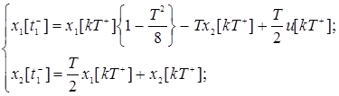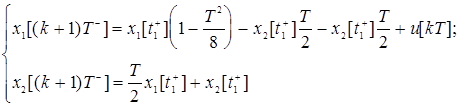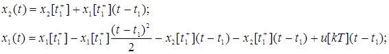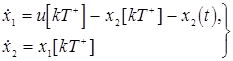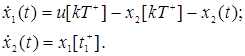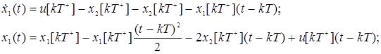 Примем за переменные состояния координаты х1, х2. Входное воздействие u(t) будем считать непрерывной функцией. Рассмотрим временной интервал (kT,t1) и запишем дифференциальные уравнения, соответствующие переходу kT+ :