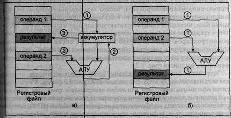 Рис. 17. Сравнение аккумуляторной (а) и регистр-регистровой архитектуры (б)