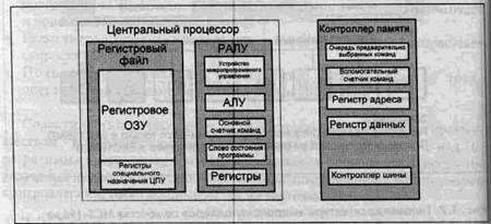 Модуль центрального процессора. Модуль центрального процессора обеспечивает выполнение программы пользователя и состоит из центрального процессора (ЦПУ) Central Processing Unit (CPU) и контроллера памяти Memory Controller (рис. 19). В состав центрального процессора входят регистровый файл Register File и регистровое арифметико-логическое устройство (Register Arithmetic-Logic Unit) или сокращенно РАЛУ (RALU).