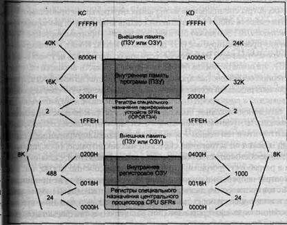 Типичная схема организации памяти 16-разрядных микроконтроллеров Intel на примере 8ХС196КС и 8XC196KD приведена на рис. 20.