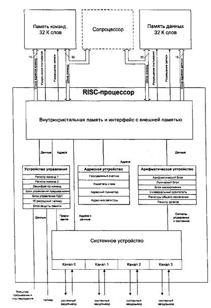 Процессор выбирает из памяти команд 32-разрялные команды и помещает их сначала в первый, а затем во второй регистры команд, далее декодирует команды и формирует управляющие сигналы для всех функциональных блоков процессора. Блок управления прерываниями обеспечивает приоритетную схему обработки 10 типов внешних и внутренних прерываний. Блок ПДП прямого доступа в память позволяет выполнять вычисления одновременно с обменом данными по 4 коммуникационным каналам. Блок защиты данных предназначен для защиты фрагментов памятей команд и данных, выделяемых под операционную систему.