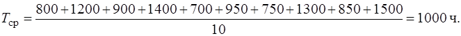 Пример. Наблюдения за эксплуатацией 10 электродвигателей выявили, что первый проработал до отказа 800 ч, второй – 1200 и далее соответственно; 900, 1400, 700, 950, 750, 1300, 850 и 1500 ч. Определить наработку двигателей до внезапного отказа,