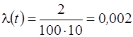 Пример 1. При эксплуатации 100 трансформаторов в течение 10 лет произошло два отказа, причём каждый раз отказывал новый трансформатор. Определить интенсивность отказов трансформатора за период наблюдения.