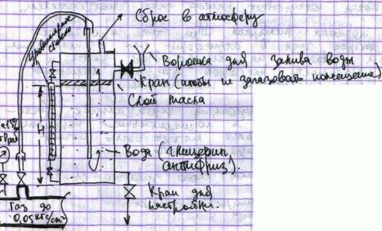 Жидкостной ПСУ представляет собой сварную конструкцию в виде трубы Æ219мм. Высота определяется в зависимости от давления газа в газопроводе. Труба заглушена с двух сторон, т.е. образована емкость. В емкости имеется трубка, которая соединяется с выходным контролируемым давлением газа. В верхней части этого ПСУ врезан патрубок, предназначенный для сброса газа в атмосферу. ПСУ заливается водой или другой жидкостью с поправкой на плотность этой жидкости. Уровень жидкости определяется расчетом в зависимости от давления в газопроводе. Сверху на воду заливается слой масла для предотвращения испарения воды.