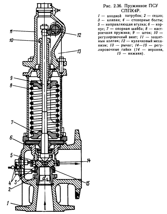 Сбросной предохранительный клапан СППК состоит из корпуса с двумя патрубками. Снизу входной сопловидный патрубок, сбоку – патрубок для сброса газа в атмосферу. В корпусе имеется сменное седло, направляющая втулка, в которой расположен клапан, соединенный со штоком, на котором находится регулировочная настроечная пружина под крышкой, прикрепленной к корпусу. В верхней части штока имеется кулачковый механизм с рычагом, предназначенный для подрыва клапана вручную, т.е. проверки его на срабатывание. В верхней части штока имеется специальная гайка, с помощью которой регулируется усилие пружины. Гайка и кулачковый механизм находятся под колпаком.