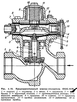 Если разность давлений газа под мембраной и над ней станет меньше 1000…1500 кгс/м2, то усилие, создаваемое газом снизу на мембрану, окажется недостаточным для сжатия пружины 4, мембрана вместе со штоком и плунжером опустится и перекроет проход газа. При этом сопло Д отойдет от пробки и откроется его вертикальное отверстие. Клапан вновь может быть включен только вручную после устранения причин, вызвавших его срабатывание. Один оборот регулировочного стакана меняет давление примерно на 300 кгс/м2 (пружина среднего давления) или на 20 кгс/м2 (пружина низкого давления).