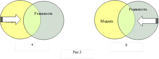 При установлении расхождения между моделью и реальностью это рассуждение устраняется путем изменения модели (модель «подгоняется» под реальность, см. рис. 3а).