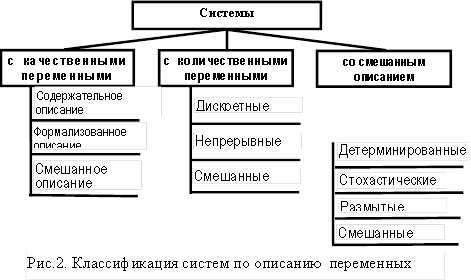 Входные, выходные и внутренние (если речь идет о «белом ящике» характеристики системы называются переменными системы. Как было сказано выше, они могут быть качественными, количественными или смешанными (пример, входы и выходы телевизора: включение, выключение - качественные, величина напряжения, сила сигнала - количественные). Соответственно, имеем классификацию систем по описанию переменных (см. рис.2).