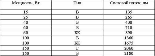 Некоторые технические данные ламп накаливания общего пользования (ГОСТ – 2239.-79)