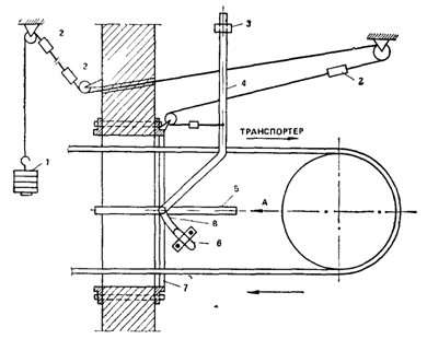 Принцип действия этого устройства заключается в том, что при плавлении легкоплавкого замка 2 клапан 5 уже не удерживается контргрузом 1 и под давлением груза 3, закрепленного на рычаге 4, закрывается, прижимаясь к раме 7. При этом кулачок 8, закрепленный на оси клапана, нажимает на шток конечного выключателя 6, останавливая транспортер.