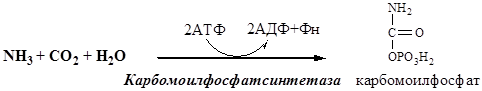 Предварительно в митохондриях под действием карбамоилфосфатсинтетазы I с затратой 2 АТФ аммиак связывается с СО2 с образованием карбамоилфосфата: