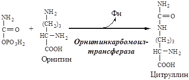 1. В митохондриях орнитинкарбамоилтрансфераза переносит карбамоильную группу карбамоилфосфата на орнитин и образуется — цитруллин: