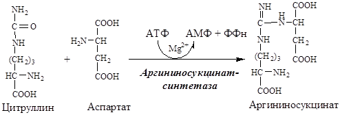 2. В цитозоле аргининосукцинатсинтетаза с затратой 1 АТФ (двух макроэргических связей) связывает цитруллин с аспартатом и образует аргининосукцинат (аргининоянтарная кислота). Фермент нуждается в Mg2+. Аспартат — источник второго атома азота мочевины.