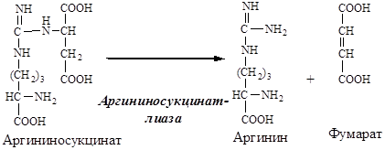 3. В цитозоле аргининосукцинатлиаза (аргининсукциназа) расщепляет аргининосукцинат на аргинин и фумарат (аминогруппа аспартата оказывается в аргинине).