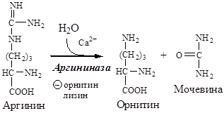4. В цитозоле аргиназа гидролизует аргинин на орнитин и мочевину. У аргиназы кофакторы ионы Са2+ или Мn2+, ингибиторы - высокие концентрации орнитина и лизина.