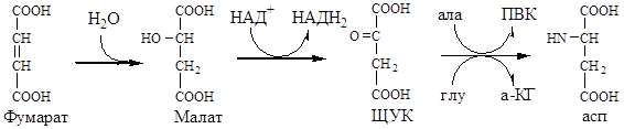 Фумарат, образующийся в орнитиновом цикле, в цитозоле превращается в ЩУК, который переаминируется с аланином или глутаматом с образованием аспартата. Аланин поступает главным образом из мышц и клеток кишечника: