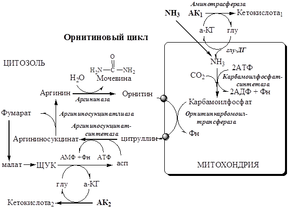 Образующийся орнитин взаимодействует с новой молекулой карбамоилфосфата, и цикл замыкается.