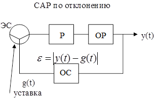 В системе автоматизированного регулирования по отклонению, непосредственным сигналом к изменению режима работы регулятора служат изменения выходной характеристики объекта регулирования (ОР). Как только выходная характеристика изменяется под действием внешнего возмущенного фактора или внутренних характеристик системы, то происходит коррекция работы ОР с помощью регулятора (Р) , за счет сигналов по цепи обратной связи. Система автоматического регулирования по отклонению дополнительно включает в себя элемент сравнения (ЭС). САР по отклонению: