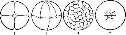 Характер дробления определяется не только количеством желтка и распределением его в яйцеклетке, но и взаимным расположением клеток, которые образуются в результате дробления.