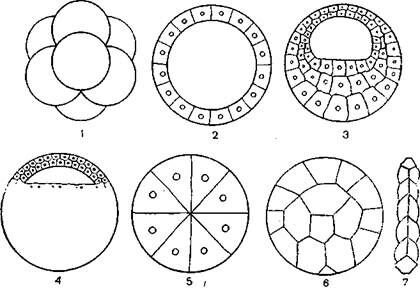 / – морула; 2 – цслобластула; 3 – амфнбластула; 4 – дискобластула; 5 – стерробластула; 6 – перибластула; 7 – плакула.