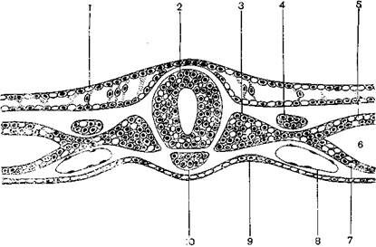 1 - эктодерма- 2 - нервная трубка; 3 – сомит; 4 – нефротом; 5 – париетальный листок спланхнотома; 6 – целом; 7 – висцеральный листок спланхнотома; 8 – кровяной островок; 9 – энтодерма; 10 – хорда.
