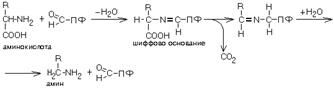 Аминокислота соединяется с активным центром фермента, в состав которого входит альдегидная группа ПФ. Образуются Шиффовы основания (альдимины и кетимины). В результате СООН-группа становится лабильной и отщепляется в виде СО2. Далее происходит гидролиз до соответствующего амина. Эта реакция необратима. Отнятие СО2 происходит без окисления.