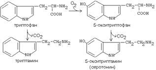 Серотонин вырабатывается в нервной ткани. Некоторые виды головных болей (мигрени) связаны с избыточной выработкой серотонина. Серотонин сужает сосуды, регулирует свертывание крови. Обладает антиаллергическим действием. Триптамин обладает сходным эффектом.