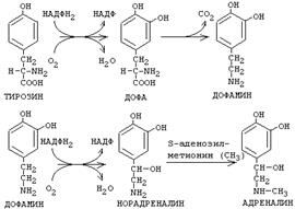 Аминокислота фенилаланин может в результате окисления присоединять две ОН-группы в кольце и превращаться в диоксифенилаланин (ДОФА). Из него под действием ДЕКАРБОКСИЛАЗЫ АРОМАТИЧЕСКИХ АМИНОКИСЛОТ образуется дофамин. Дофамин является предшественником катехоламинов - норадреналина и адреналина.