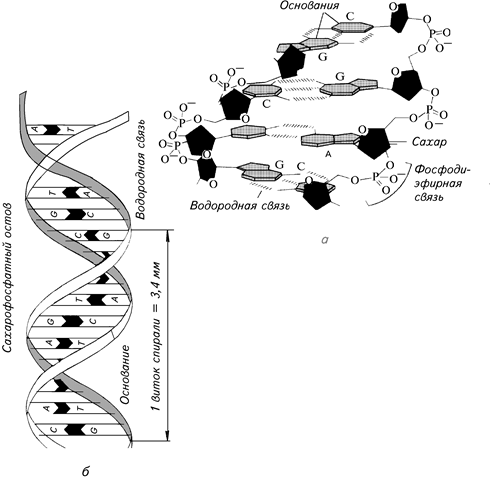 а — схема химических связей в молекуле ДНК; б — схема двойной спирали ДНК; в — три формы спирали ДНК (вид сверху и сбоку):