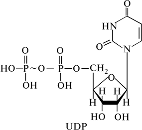Другим соединением, у которого макроэргическая связь образуется между кислородом и фосфором, является UDP – уридиндифосфат. В состав UDP входит азотистое основание – урацил, D-рибоза и два остатка фосфорной кислоты, соединенные друг с другом макроэргической связью (рис. 5).