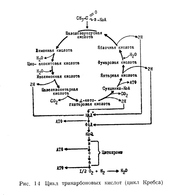 Исследования показали, что дальнейшее окисление ацетил-КоА возможно лишь в присутствии небольших количеств какой-либо ди-карбоновой кислоты. Оказалось, что в начале ацетил-коэнзима А конденсируется с щавелевоуксусной кислотой (СООН—СН2— СО—СООН) с образованием лимонной (трикарбоновой) кислоты. Лимонная кислота является первым продуктом цикла Кребса, поэтому этот цикл иногда называют лимоннокислым.
