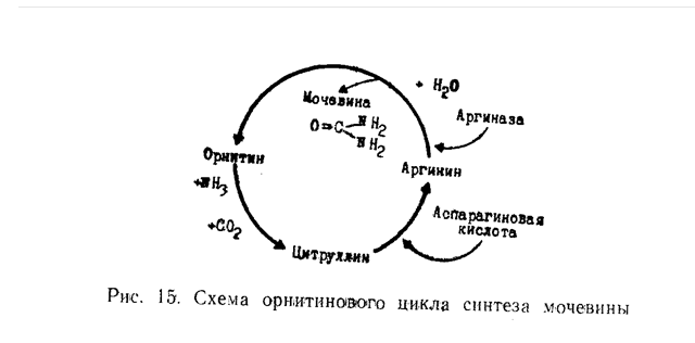 группировка переносится с карбамилфосфата на орнитин, в результате образуется цитруллин. Последний вступает в реакцию с аспарагиновой кислотой и образует аргинин. Аргинин гидролизуется ферментом аргиназой с образованием мочевины и орнитина. Немаловажное значение в нейтрализации аммиака отводится образованию амидов - прежде всего, глютамина из глютаминовой кислоты, а также аспарагина из аспарагиновой кислоты. Синтез амидов сопряжен с распадом АТФ.