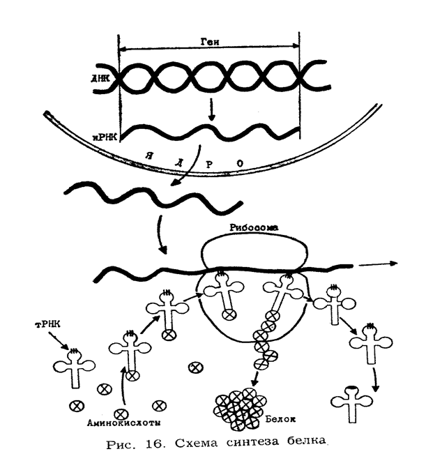 Белки различаются между собой природой и последовательностью чередования аминокислот, входящих в их состав. Последовательность включения определенного числа аминокислот в синтезируемую полипептидную цепь осуществляется в соответствии с информацией, заложенной в ДНК. Установлена прямая связь между интенсивностью синтеза белка в клетках и тканях с содержанием в них ДНК и РНК. Экспериментально доказано, что ферментативное расщепление РНК рибонуклеазой и ДНК-дезоксирибонуклеазой подавляет или вовсе прекращает биосинтез белка.
