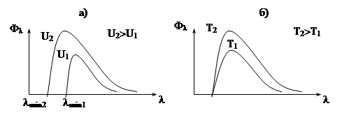 При изменении температуры Т накала катода возрастает эмиссия электронов. Следовательно, увеличивается ток I в трубке, но спектральный состав излучения не изменяется (рис. 2б).