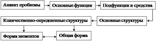 Следующей  ступенью является определение структуры. В синтезе изделия эта очень важная ступень разделена на ряд шагов, начиная с деления требуемой функции на подфункции. Затем следует изучение возможных средств реализации подфункций, сочетание их в основной структуре и, наконец, адаптация в количественно определенной структуре, где решающие параметры оптимизированы и где определено относительное расположение элементов. Форма рассматривается в двух параллельных ветвях, поскольку общая форма и формы составляющих элементов определяются одновременно. Подробная форма элементов включает спецификацию материалов, размеров и поверхностей.