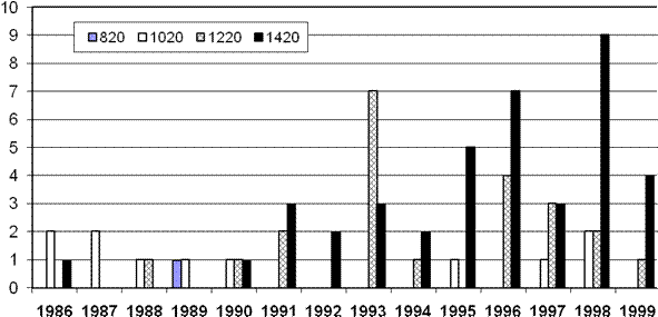 География повреждений МГ предприятий ОАО «Газпром», связанных со стресс-коррозией, характеризуется крайней неравномерностью расположения аварийных участков, несмотря на широкое распространение КРН по территории России. На рис.3 показана гистограмма распределения аварий в зависимости от диаметров МГ за период с 1986 по 1999 гг.