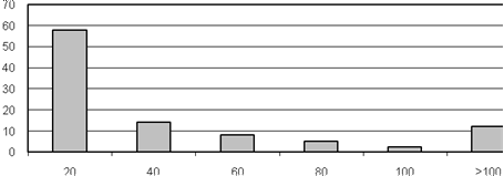 0 – 5 5 – 10 10 – 15 15 – 20 20 – 30 свыше 30 | 7 15 12 11 9 14 | 11- 01 01 –03 03 –05 05 –07 07 - 09 | 1 2 3 33 9 | 0 – 100 100 – 200 200 – 300 300 – 400 400 500 свыше 500 | 19 12 3 3 0 12 |