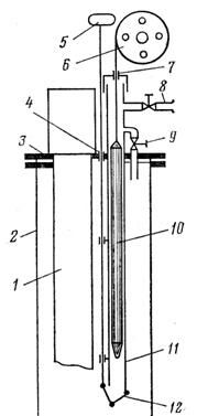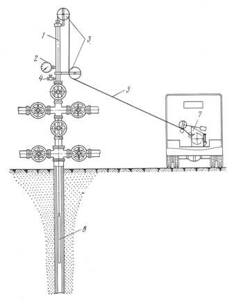 Для спуска приборов в скважины (с избыточным давлением на устье) на фонтанной арматуре должен быть установлен лубрикатор 1 (рис. 9.1), представляющий собой полый цилиндр и имеющий в верхнем торце сальник для прохода проволоки или кабеля, манометр 2 и кран 4 для сообщения лубрикатора с атмосферой. К корпусу крепится направляющий и оттяжные ролики 3 для прохода проволоки или кабеля 5.