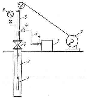 Рис. 9.5. Схема оборудования устья скважины при подкачке газа: Вместе с этой лекцией читают "13. Математическая модель изменения уровня жидкости". 1 и 6—манометры; 2—обсадная колонна; 3 — задвижка; 4 — вентиль; 5—лубрикатор; 7—лебедка; 8—компрессор;. 9—линия сжатого газа | Метод подлива жидкости применяют толь-ко для исследования непереливающих сква-жин. Этим методом одновременно проверяют степень сообщаемости ствола пьезометрической скважины со вскрытым продуктивным пластом. Способ исследования заключается в следую-щем: 1) измеряют начальный статический уровень (расстояние от устьевого фланца до уровня); 2) в скважину заливают воду; 3) прослеживают изменение уровня во времени после подлива. Статический и динамический уровни измеряют с помощью хлопушек, электрокон-тактных желонок или других устройств, спускаемых на проволоке или электрическом кабеле. Момент посадки спускаемого устройства на уровень определяют по звуку в случае спуска хлопушек или звонковых устройств; по показанию вольтметра или с помощью сигнальной лампочки в случае применения электроконтактных устройств; по ослаблению натяжения проволоки при спуске желонок, поплавков, грузов и т. п. |