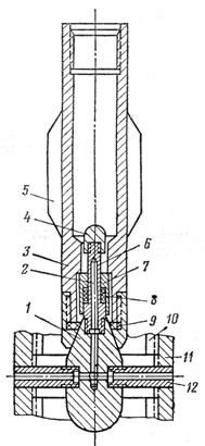 | | На рис. 9.2 показан суфлер конструкции ТатНИИ. Он состоит из муфты 11, служащей для соединения лифтовых труб и являющейся базой всего устройства; корпуса 7 с отверстиями, связанными с затрубным пространством посредством трубок 12, и клапанного устройства, состоящего из трубки 2 с отверстием 6, ползуна 7, пружины 8 и головки 4. Верхняя часть корпуса 1 выполнена в виде конуса и служит посадочным гнездом для наконечника 3 глубинного манометра. В нормальном состоянии ползун 7 отжат пружиной 8 в верхнее положение и отверстие 6 закрыто (внутренняя полость лифтовых труб 10 с затрубным пространством не сообщается). При спуске манометра его наконечник 3 садится на конус корпуса 1. При этом ползун 7 под действием веса прибора отжимается вниз, отверстие 6 открывается, что обеспечивает связь чувствительного элемента прибора с затрубным пространством. Точность посадки наконечника манометра обеспечивается направляющими пластинами 5, приваренными к его корпусу, а герметичность — уплотнительным устройством 9. |
