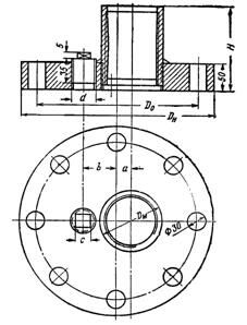 Рис. 9.4. Схема эксцентричной план-шайбы на устье скважины, оборудованной штанговым глубинным насосом. | Планшайба (рис. 9.4) создает односторонний увеличенный зазор между подъемными трубами и обсадной колонной. Рекомендуемые размеры планшайбы приведены в табл. 9.1. Таблица 9.1 Рекомендуемые размеры планшайбы в мм