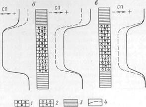 Обводнение пласта: а — в кровле; б — в подошве; в — по всей мощности. / — нефтеносный песчаник; 2 — обводненный песчаник; 3 — глина; 4 — кривые СП при отсутствии обводнения пласта.