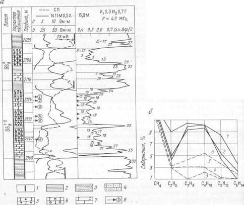 — условная нулевая линия глин по СП; 2 — глина; 3 — алевролит; 4 — известковистый песчаник; 5 — нефтеносный песчаник; 6 — нефтеводоносный песчаник; 7 — водоносный песчаник; 8 — места отбора проб пластовых флюидов. На рис. б кривые 1—6 характеризуют содержание газа в пластах, отмеченных цифрами в кружочках.