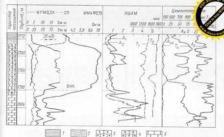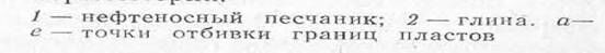 / — глина; 2 — алевролит; 3 — нефтеносный песчаник; 4 — обводненный нефтеносный песчаник; 5 — водоносный песчаник.