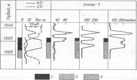 Рис. 167. Выделение пластов, обводняющихся пресными водами, по данным повторных измерений ИННМ-Т в неперфорированном пласте. / — нефть; 2 — пресная вода; 3 — минерализованная вода.