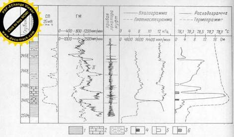 /, // — кривые ГМ, зарегистрированные до и после обводнения, / — глина; 2— песчаник; 3 — алевролит; 4 — нефть; 5 — вода; б — нефть с водой