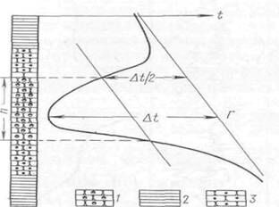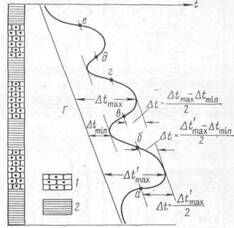 Достаточно высокую эффективность при выделении обводняющихся пластов нагнетаемыми водами показали методы термометрии. В связи с различием температур нагнетаемых и пластовых вод процесс вытеснения нефти водой сопровождается изменением температуры пласта. Обычно температура нагнетаемых вод ниже пластовой, поэтому обводненный пласт выделяется по отрицательным температурным аномалиям при сравнении термограммы с геотермой (рис. 169). В интервале появления отрицательной температурной аномалии на термограмме выделяется точка минимальной температуры и определяется ее отклонение Δt от геотермы Г. Точки пересечения линии, проведенной на расстоянии Δt/2 параллельно геотерме, с термограммой определяют интервал прохождения температурного фронта нагнетаемых вод. Обводнение пласта в интервале прохождения температурного фронта устанавливается по положению точки минимальной температуры.