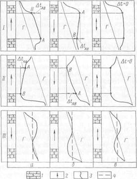 Термограмма может быть расположена выше геотермы, ниже геотермы и пересекать геотерму. В первом случае источник поступления флюида определяется по точке А максимальной температуры(рис. 184, I, а,б). Если максимум температуры находится внизу, то переток флюида происходит из нижнего пласта в верхний, если вверху —то из верхнего пласта в нижний. При неопределенном положении точки максимальной температуры сравниваются давления в пластах или величины депрессии на верхний пласт, которая рассчитывается по формуле Δр = Δt/εт где Δt — отклонение от геотермы; εт — коэффициент Джоуля — Томсона для жидкости, насыщающей верхний пласт. Источником перетока является нижний пласт с высоким давлением или с Δр, превышающей реальные различия давлений верхнего и нижнего пластов (рис. 184, II, в). Если термограммы расположены ниже геотермы, источник поступления флюида определяется по точке минимальной температуры В. Если минимум температуры находится внизу, то флюид перетекает из нижнего пласта в верхний и нижний пласт является либо газоносным, либо обводненным нагнетаемыми водами с температурой ниже пластовой. В случае, когда минимум температуры находится вверху, флюид перетекает из верхнего пласта в нижний (рис. 184, II, а, б). Если положение минимума неопределенно, источником перетока служит либо газоносный, либо обводненный закачиваемыми водами пласт. Источник перетока устанавливается по давлению в пластах (рис. 184, II, в).