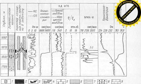Когда термограмма пересекает геотерму, источник поступления флюида определяется по расположению термограммы относительно линии, параллельной оси глубин. Если термограмма расположена преимущественно правее этой линии, то переток флюида происходит из верхнего пласта в нижний, если левее, то из нижнего пласта в верхний (рис. 184, III, а, б). В случае, когда в перемычке между пластами градиент температур равен нулю, источник перетока выделяется на основе анализа характера насыщения пластов (рис. 184, III, в). При этом учитывается, что вверх перемещаются газ и нагнетаемые воды с температурой ниже пластовой.